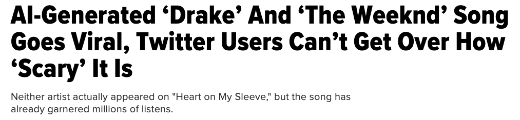 The latest Drake / Weeknd song made by robots (that garnered millions of streams, and a tweet from Universal Music shaming the person who released it) proves that if you make music that can be easily replicated to begin with, robots will undoubtedly replace you...and no one will give a single fuck.
