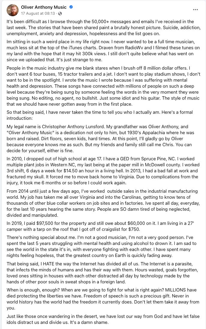 The irony of Oliver Anthony's story, is that if he wrote this song the same week he signed a deal, it’d never be released. It never would’ve mattered.